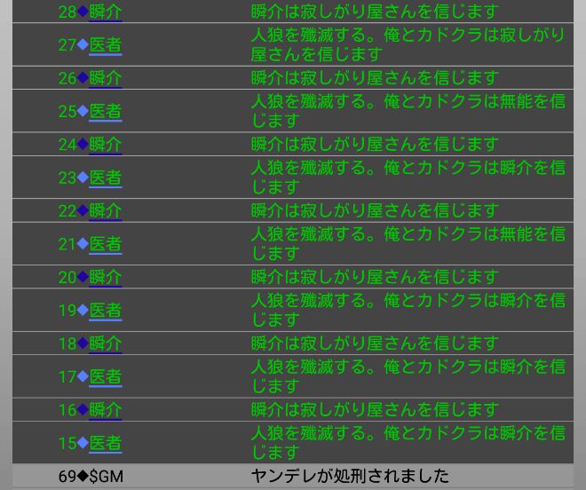 瞬介「俺は・・・生きているなあ。2人の霊能者がヤンデレ●を提示している。無能は真占い師っぽいぞ」