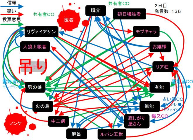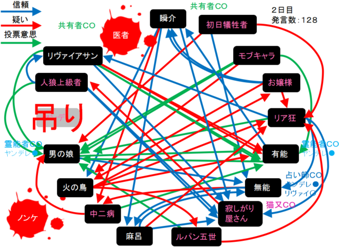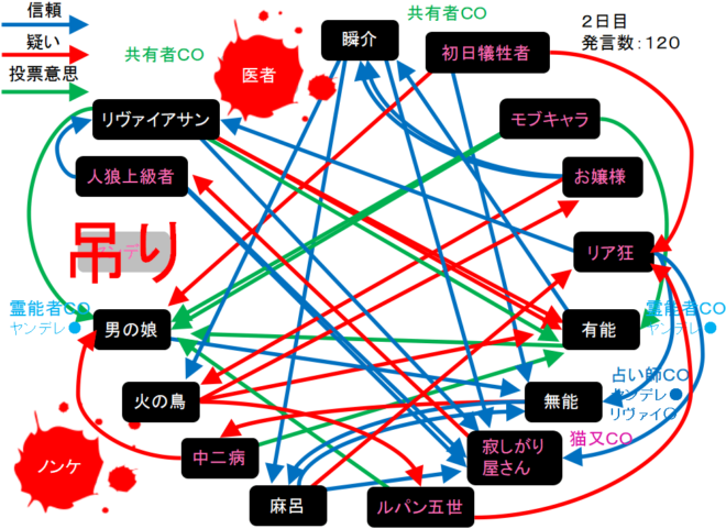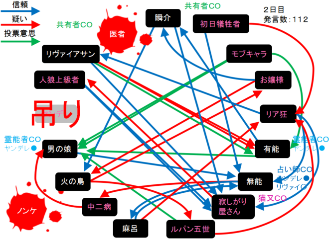 瞬介「真面目に・・・わからん!無能がリア狂を疑っている。明日はリア狂(人狼候補)を占ってほしい」