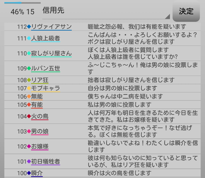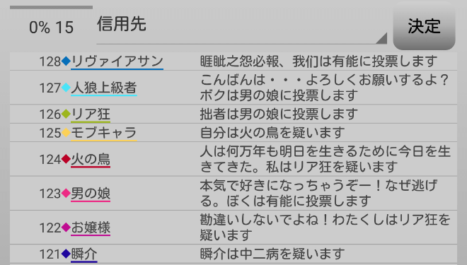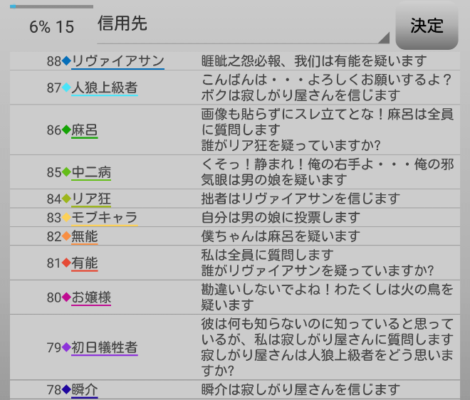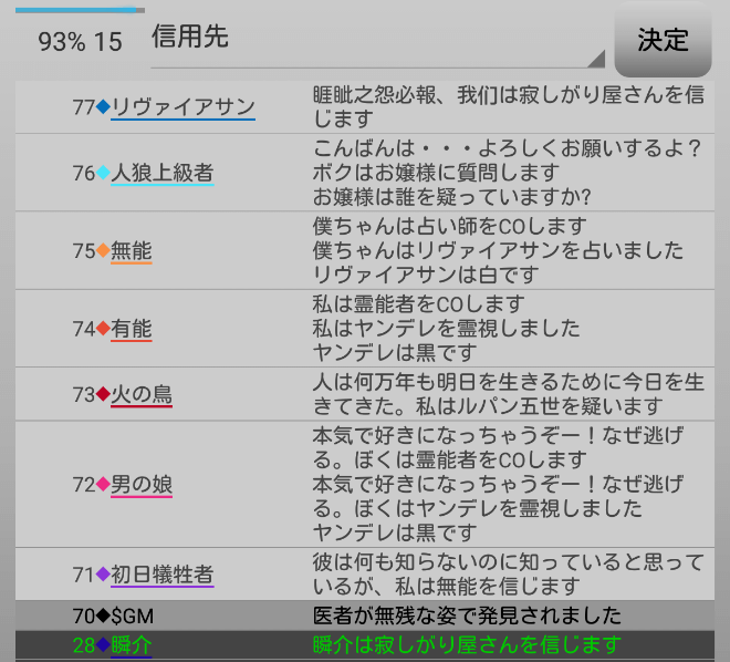 頼むから人狼候補を占ってくれ。最後の発言になります。俺はリア狂を疑う『無能を信頼します!』。