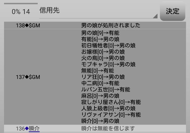 瞬介「議論はこれで終わり。投票の時間になります。今日は霊ロラだ。男の娘が票を集めているな。信頼を得るために俺も『男の娘へ投票』をしよう」