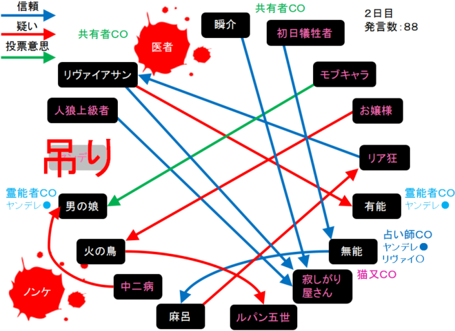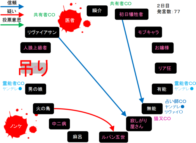 今日は霊ロラだね。うーむ、やることがねえ。俺は猫又の『寂しがり屋さんを信頼します!』。