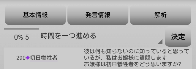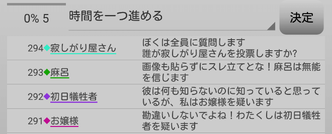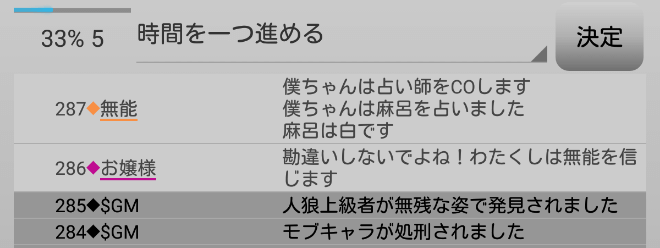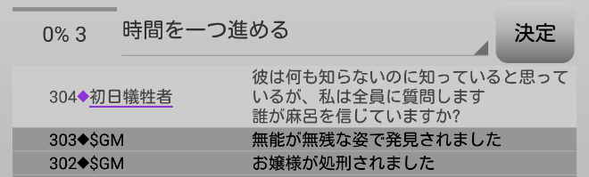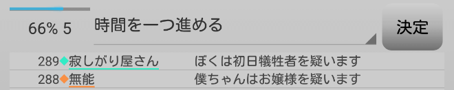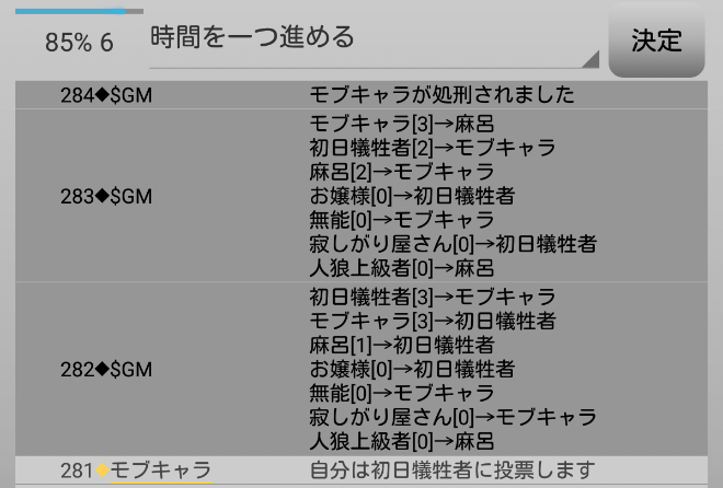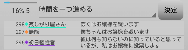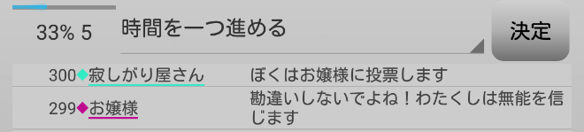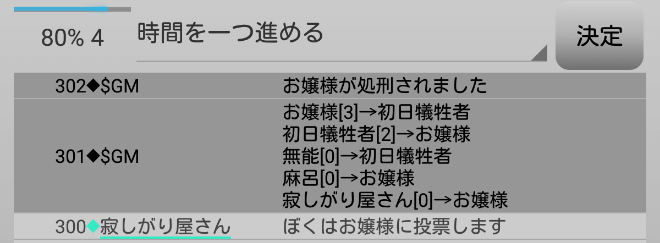 吊り対象はお嬢様と初日犠牲者の2名だ。ここで初日犠牲者を処刑できれば必勝。お嬢様を処刑してもモブキャラが妖狐だったのなら勝てる。次にいきます。