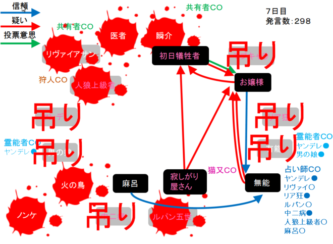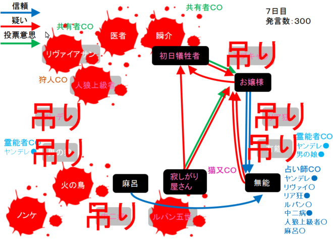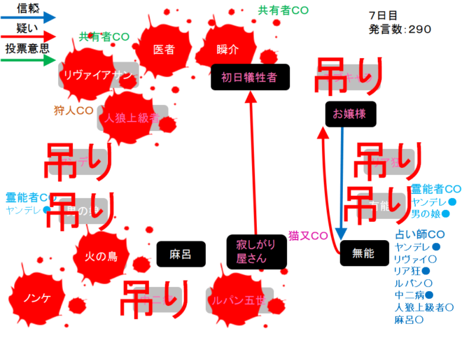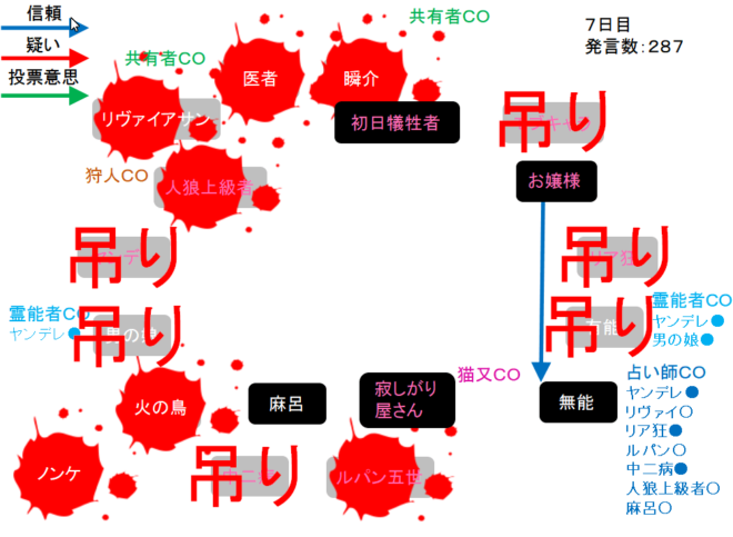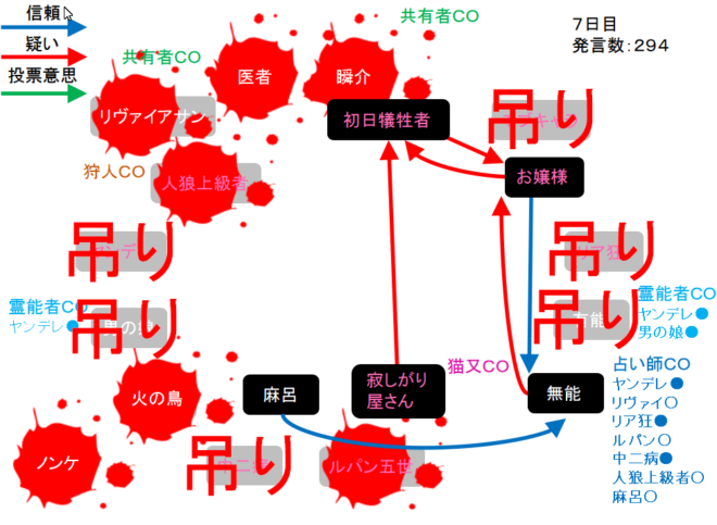 無能は麻呂○を提示した。呪殺が起きていたら吊り回数は1回になっていたのか(いまさら!)。LWはお嬢様だが・・・妖狐は初日犠牲者?次にいきます。