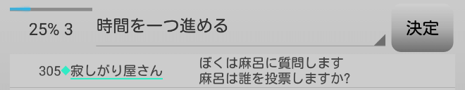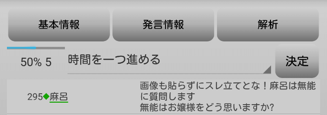 AI達が色々と推理をしているようだ。寂しがり屋さんの全員質問は意味があるのかね。人外が真役職者を疑ったりするのかな。次にいきます。