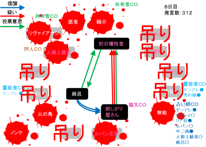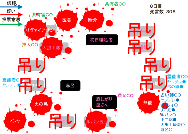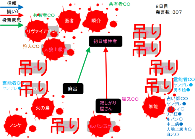 お嬢様が処刑されたあ(泣)。これで妖狐勝利に・・・なってない!?うそ!?お嬢様がLWじゃなかったの!?俺はどこで勘違いをしたんだ!?えーと、8日目を開始します。どうなるの!?そいっ!