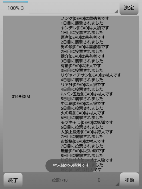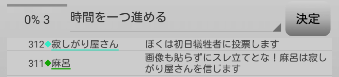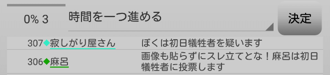 初日犠牲者が妖狐ならば見事としか言いようがない。ここまで占われもせず、グレランでモブキャラを処刑するなんて負けても後悔は無いよ。次にいきます。