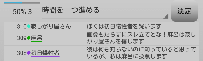 無事に初日犠牲者を処刑できそうだ。初日犠牲者は霊ロラの時に人狼へ投票をしていた気がするんだけどなあ。『人狼は人狼に投票しないよ』の法則が通用しなくなっている!?次にいきます。