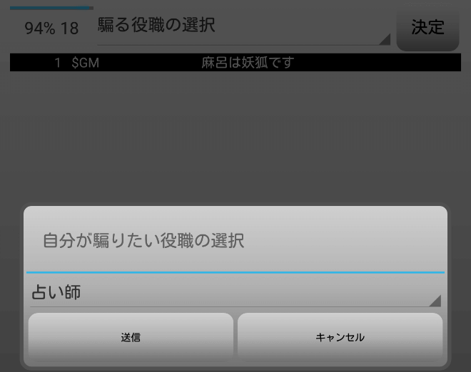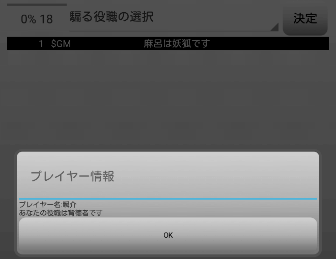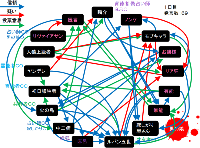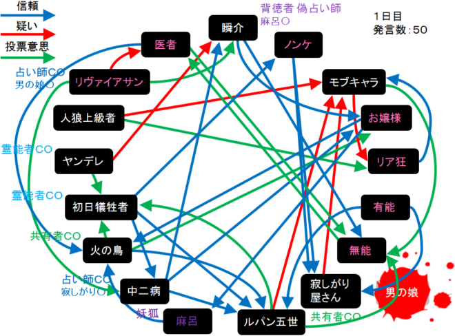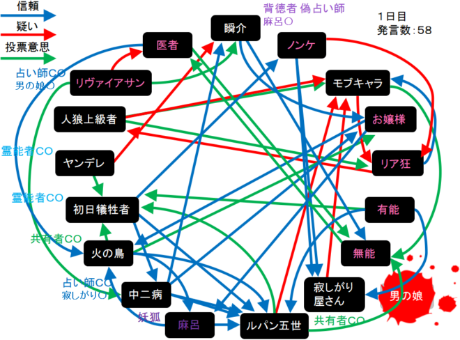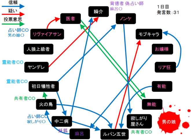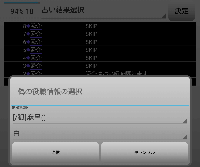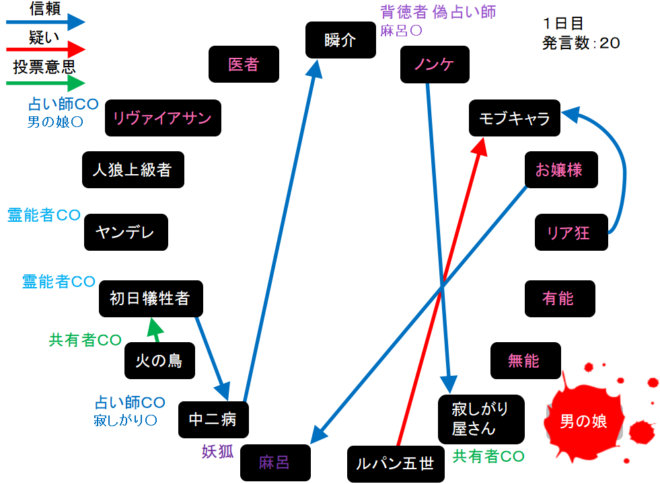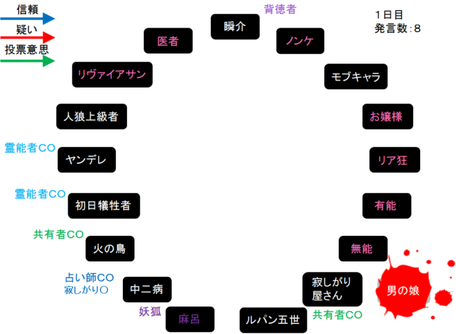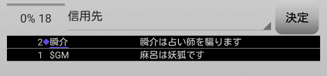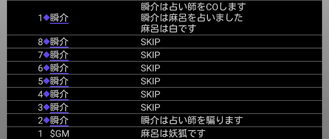 瞬介「騙る役職を占い師にしました(上の図)。1日目に提示する偽占い結果は麻呂○だな。妖狐に○を出して、あとは成り行きに任せようぜ」