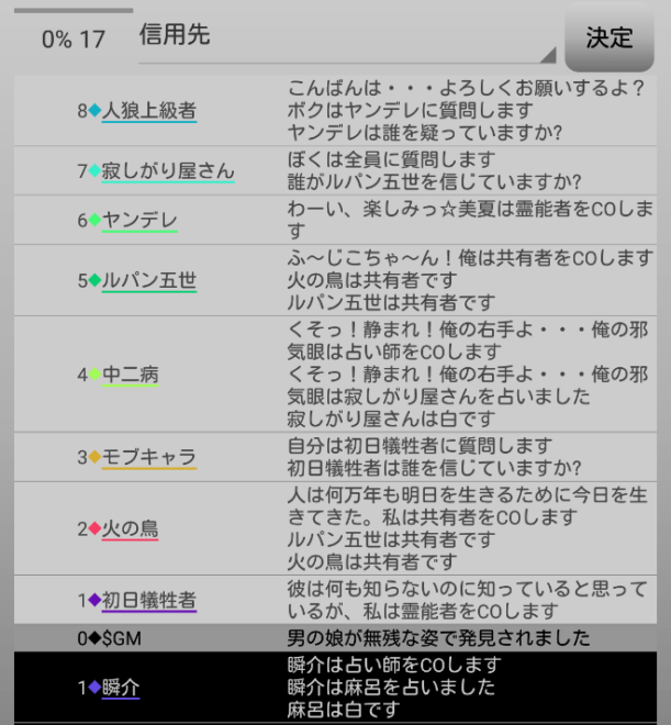 瞬介「うーん。まずは偽占い師をやってみようか。18Z猫村における背徳者占い師の難易度を知りたい」