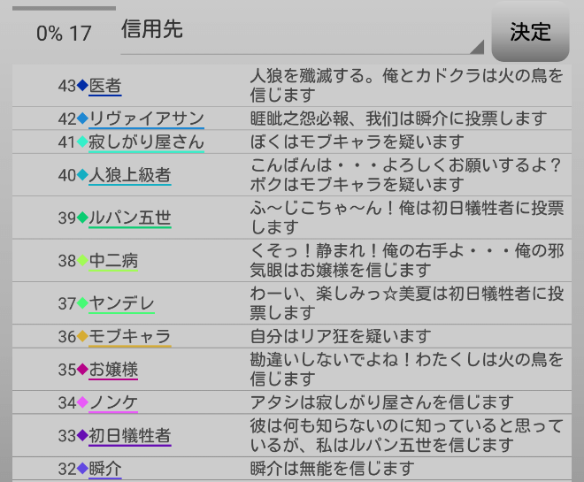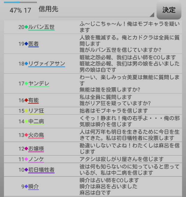 人狼っぽいプレイヤーを信頼しておこうか。AIに伝わるか分からないけど、狂人だと思われたいんだよ。