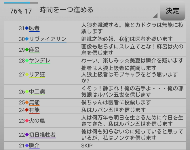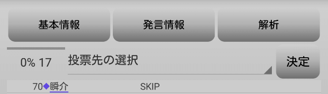瞬介「今日は初日犠牲者(霊能者)が吊られちゃうかなあ。それでも良いけどね。最後の発言になります。意思は示したので『スキップ』します」