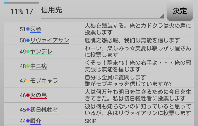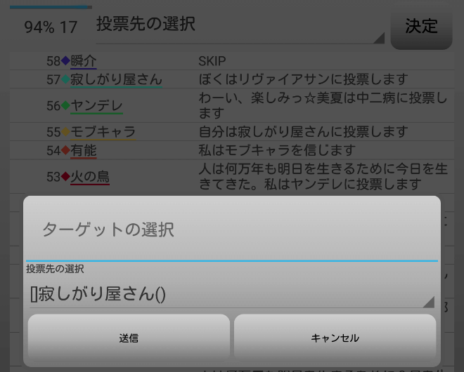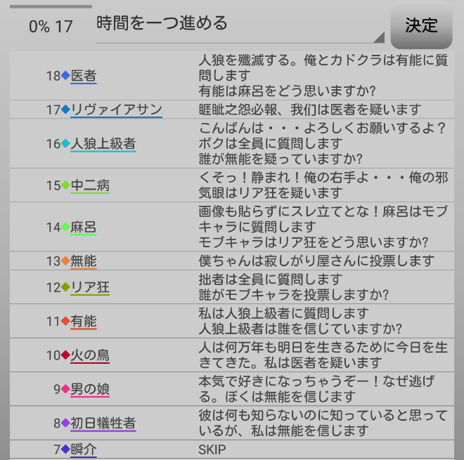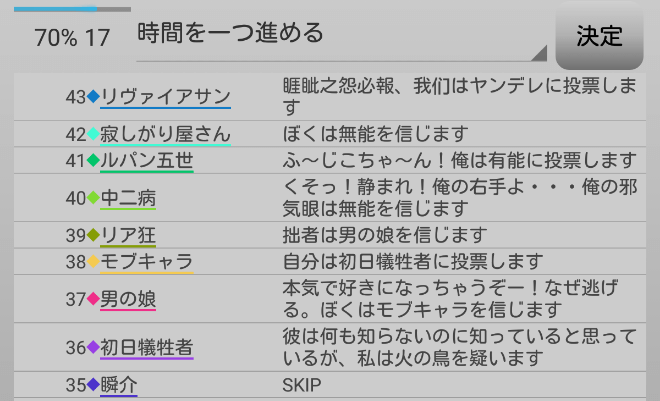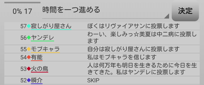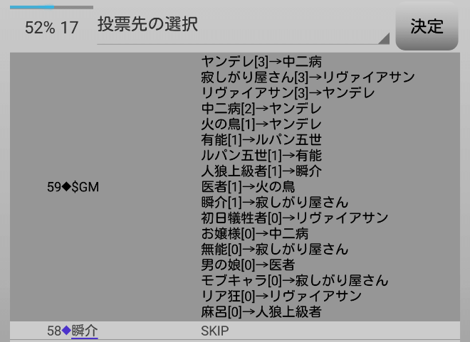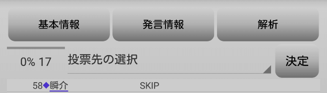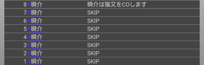 瞬介「人狼上級者から投票宣言をされてしまった。発言をしすぎたかもな。『スキップ』をして潜伏します!」