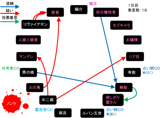 瞬介「初日に退場をする村人はわかりません。以前、18D猫村をプレイした時は連敗をしたんだけど、18Z猫村と変わらないと思うんだよなあ。狂信者が霊能者COをしたら同じことでしょう?」