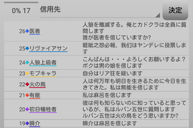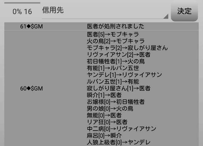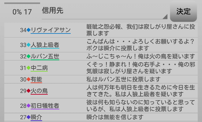 しかし、危ない橋を渡らないと勝てないのでは?それに人外っぽい奴を信頼すれば村の推理に役立つ・・・混乱させるだけか(泣)。