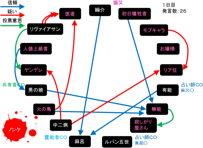 瞬介「ヤンデレ、寂しがり屋さん、リヴァイアサンが同票だ。リヴァイアサンは人狼ではない。ヤンデレと寂しがり屋さんも人狼ではなさそうだな」