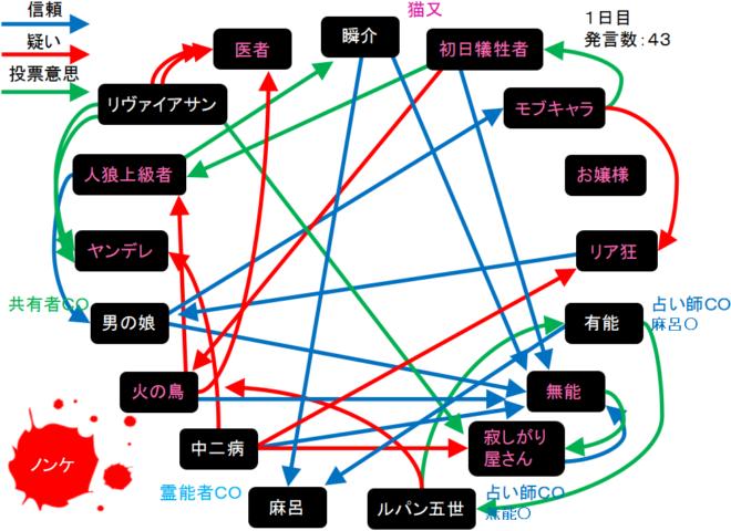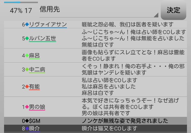 瞬介「初日犠牲者が良い推理をしている。信頼をしたいがグレー村人に信頼発言を飛ばすのは厳しい(泣)」