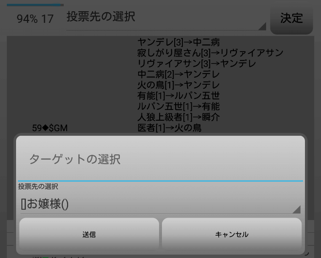 得票をしておらず人狼候補以外に投票をしている者を人狼と考えよう(泣)。お嬢様あたりが怪しいかな。『お嬢様に投票』をします。
