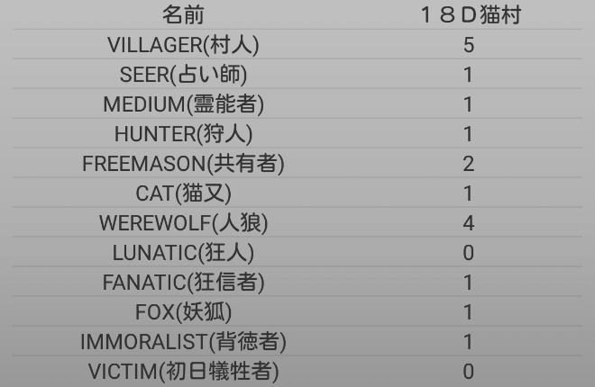 今回は18D猫村にて猫又を担当します。前回までプレイしていた18Z猫村の狂人を狂信者に変更しますね。