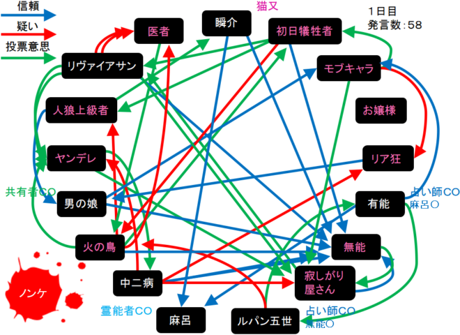 瞬介「1日目は医者(人狼候補)を処刑した。医者は人狼ではないだろうなあ。医者に投票をした寂しがり屋さん、リア狂あたりが怪しいかな?」