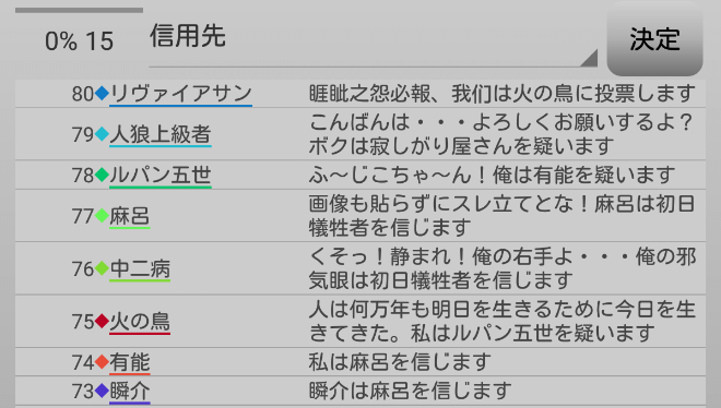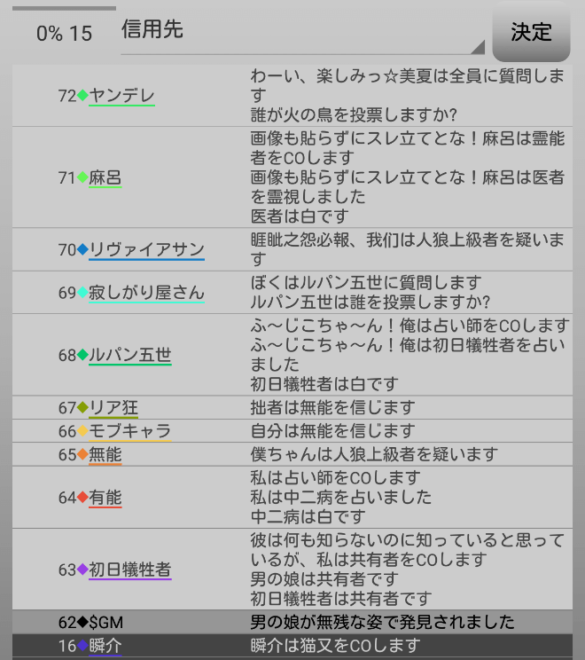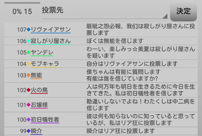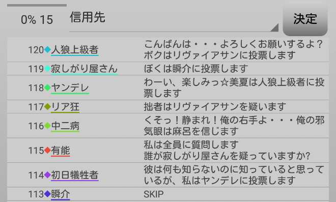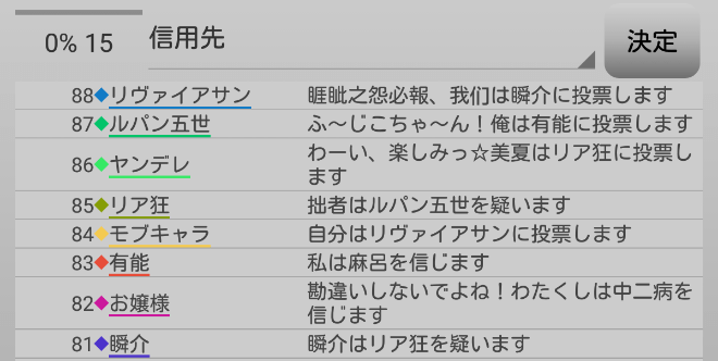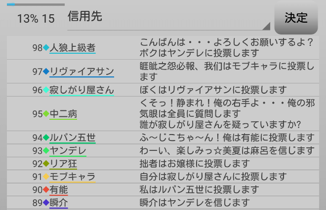 休憩をとりました。ヤンデレは人狼じゃない気がする。ヤンデレと一緒にリア狂を処刑してしまおう。俺は『ヤンデレを信頼します!』。