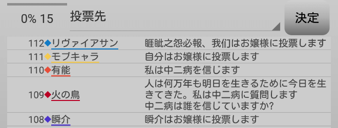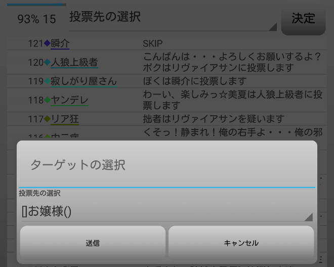 なんとなく、潜伏ぎみのお嬢様が怪しい。挑発してみようか。俺は『お嬢様に投票をします!』。