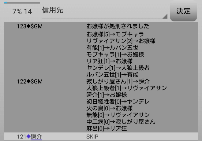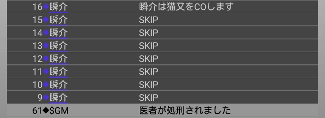 あまり敵意を飛ばしすぎると俺が処刑をされる。発言を控えるために『スキップ』します。