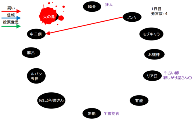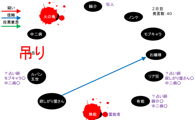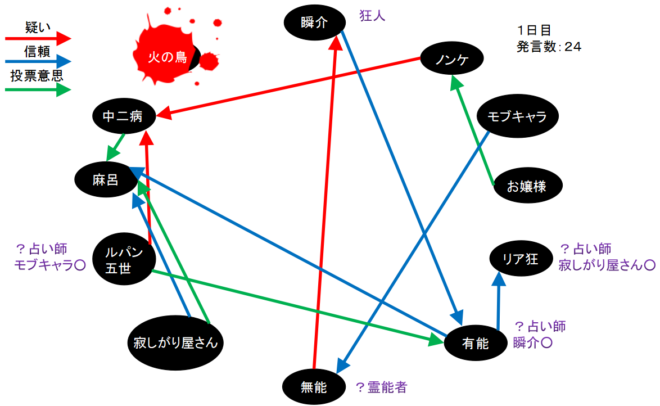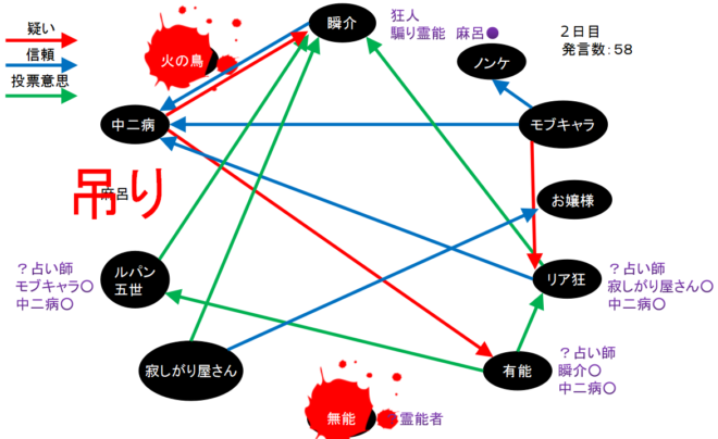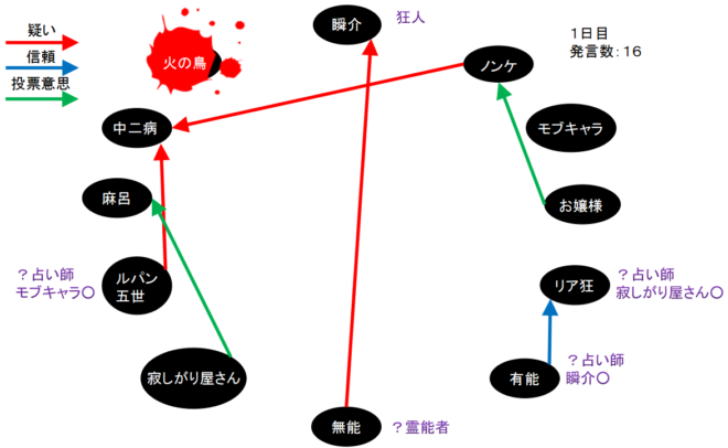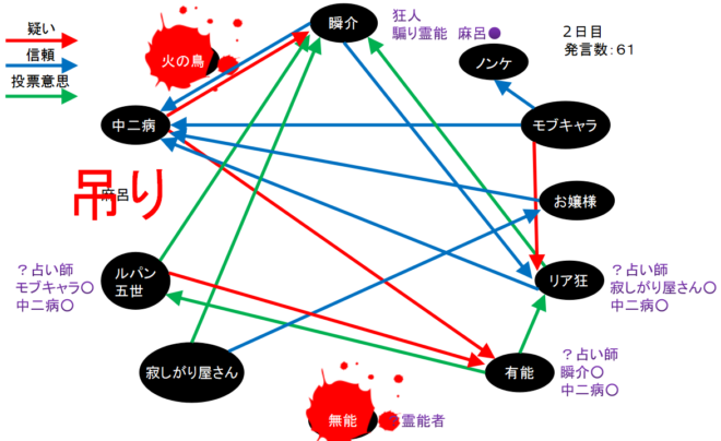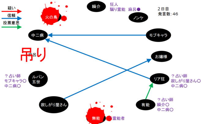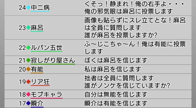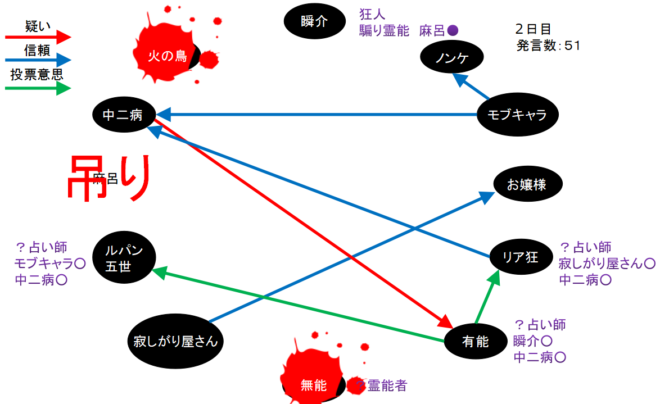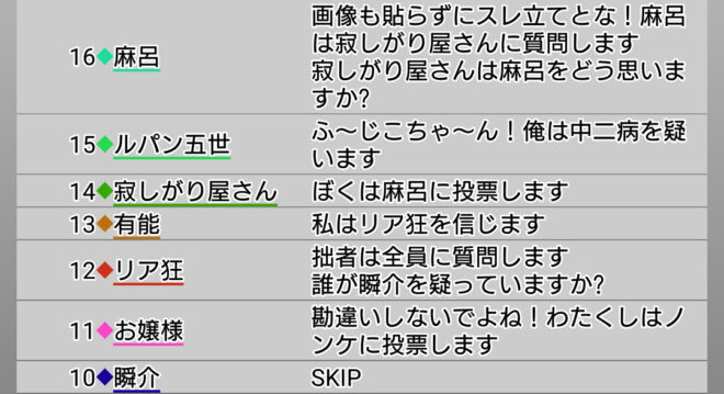 スッと占い師に投票して吊りたい気持ちにはなるけど、うまいこと票が散らされている。今回の吊りは麻呂かなあ。無能とリア狂と火の鳥がいないとグレーは生き残るのが難しそうだね『スキップして麻呂に投票宣言をします!』。