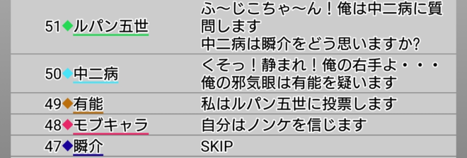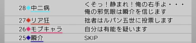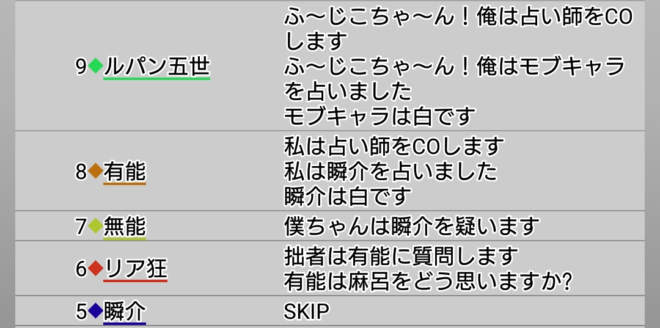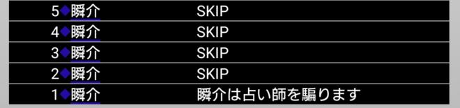 瞬介「おや?俺が有能占い師から○出しをされたみたいだぞ。えっと、ルパンも占い師COをしてるの!?もう3-1なんすか!?ええと、ここで俺がCOしたら4-1になるんでしょ!?しちゃっていいの!?わからないんだけど(笑)。俺がCOすると占い師ロラで人外が3人も吊られちゃうよな。人外が吊られちゃうのはまずいよね。それに俺がCOすると有能とぶつかるんだが、奴の出かたが人狼っぽい(笑)。ここは無理をせず守りに入ります!『スキップ』です!」