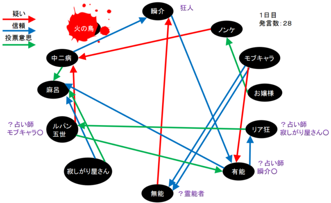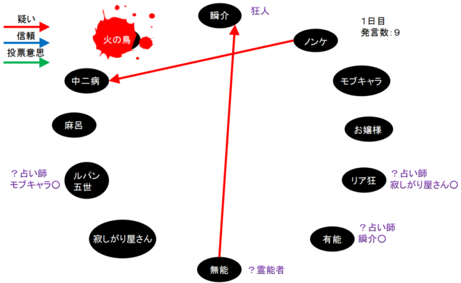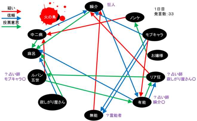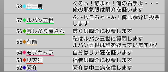 瞬介「投票宣言が飛び交ってはいるけど、ほとんどが占い師達のものだ。だからといって素村人が占い師に投票してはいけない。一撃でしとめないと次に吊られるからなあ(笑)。緑線のほとんどはブラフ。今回はグレー吊りというのが暗黙の了解だろう」