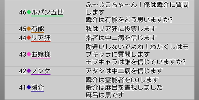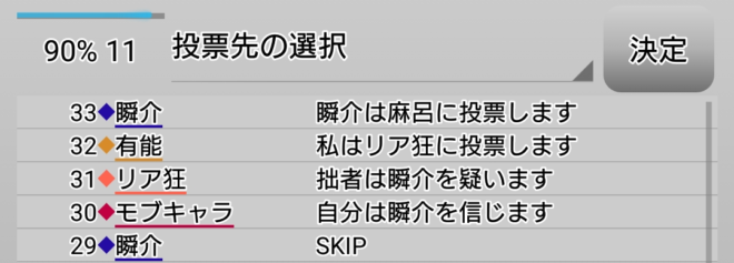 瞬介「おいおい、これやばいぞ。もう投票宣言が乱れ飛んでいる。3-1はグレー吊りなのか(今知った)。リア狂に注目されてしまっているので、そろそろ何かしゃべらないとまずいかもしれない。だけど発言することなんてあるか?COしたら4-1になっちゃうしさ(笑)。まあ『俺に○を飛ばした有能を信じる』これしかあるまい」
