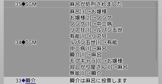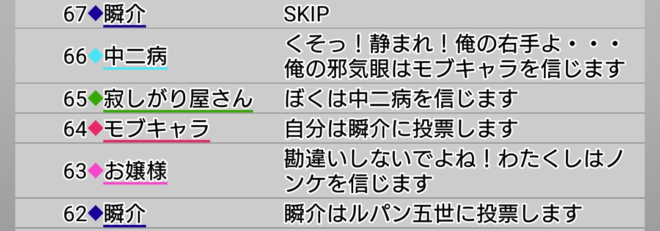 瞬介「1回スキップを挟んだのは麻呂から投票宣言をされないようにしたからである。『発言しやすさ』という性格があるので残りの発言回数が少ない時に敵意を飛ばした方がよさそうだろう?効果があったかどうかは不明」