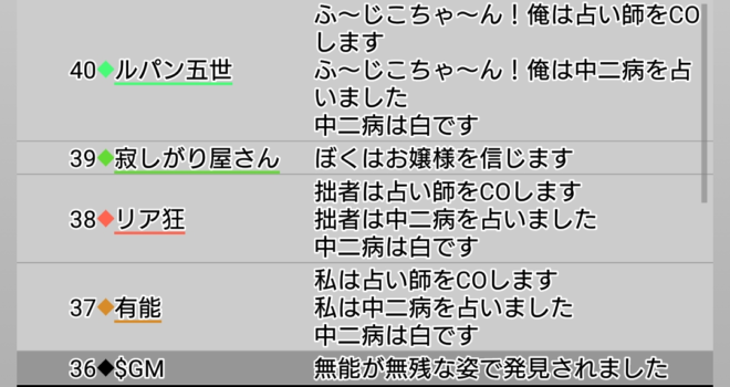 なんだか不思議なことが起こるものだなあ。そしてここで俺が『霊能麻呂●出し』をすることにより真アピしながら皆の目を怪しい占い師どもへ向けるという作戦だったよな。