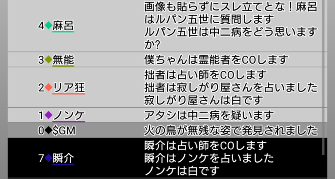 瞬介「真霊能が噛まれたってのに、わざわざ出てくる狂人なんていないですもんねえ?だから真霊能者が命がけで●出しをしたわけなんですよ、それが僕なんです!僕も『中二病を信じる』善良な村人です!」