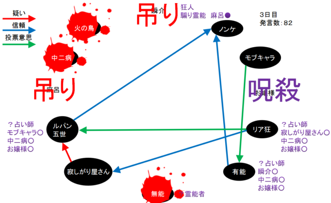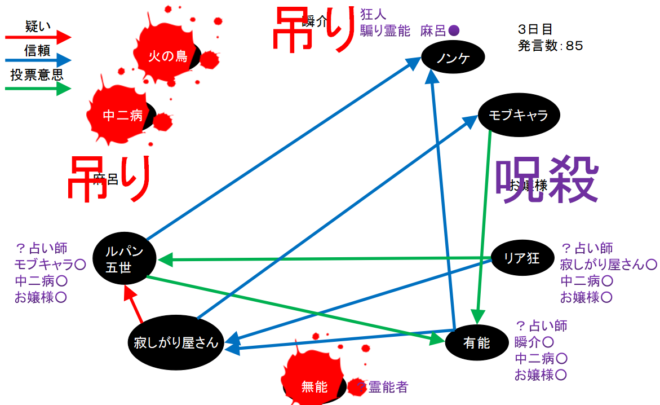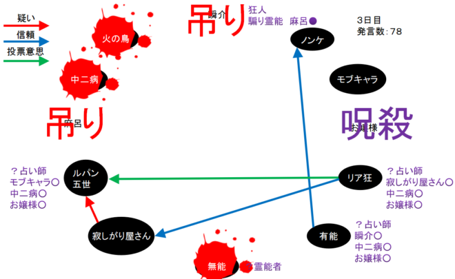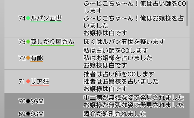 瞬介「ちょっ・・・何これ!?朝の被害者が2人いるってことは呪殺が決まったってことだよね。確定○の中二病は噛まれたわけでお嬢様が妖狐だったんだけど、占い師3人の占い先がお嬢様だから真を特定できない!」
