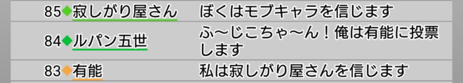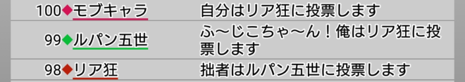 瞬介「有能は信頼構築、ルパンは有能投票を決断か。ルパンは信頼獲得が下手だった記憶がある(笑)。しかし占い師の投票は有能へと集まりそうだぞ。モブキャラはルパンの○か。2人が投票を合わせたとしても、不自然はない・・・のかな」