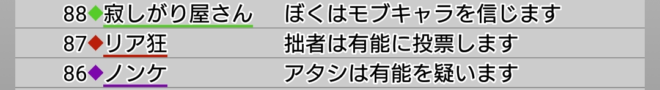 難しいなあ。見ていて全然わからないよ(笑)。村人からは『真』-『狂』-『狼』の可能性もなくはないのかな?昨日はなんとしても生き残らなければならなかった(泣)。