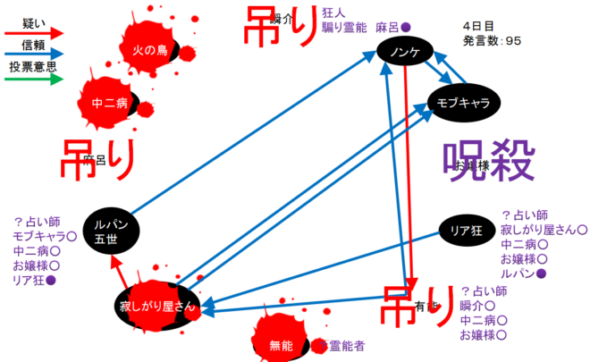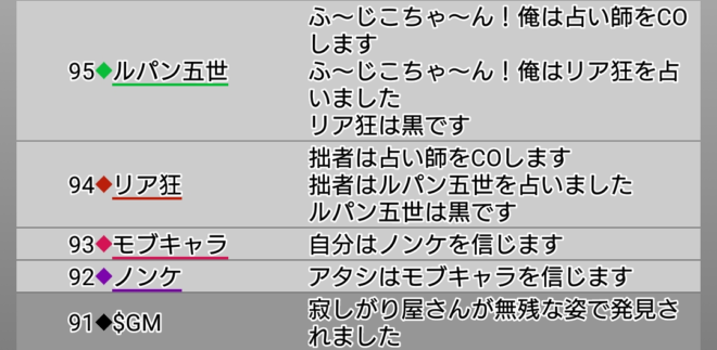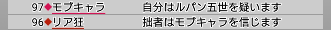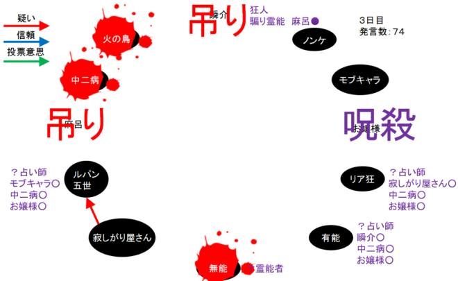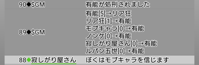 瞬介「噛みはルパン疑いだった寂しがり屋さんだ。人狼ルパンが自分を疑っている寂しがり屋さんを噛み、自身の○出しプレイヤー『モブキャラ』を生かしたと見える。その裏をかいたとも考えられるけど、この噛みで怪しいのはルパンかなあ。前日の投票までの動きで怪しかったのはリア狂の方だったのに」