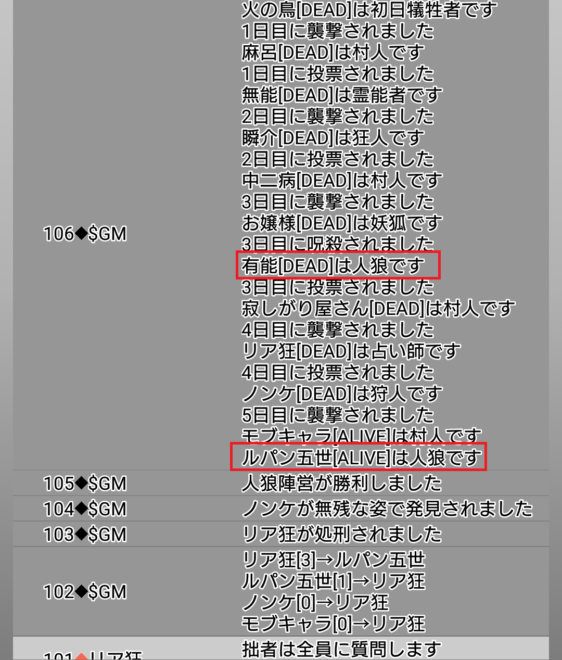 瞬介「人狼は有能とルパンだったのか!お前ら強いよ(笑)。この2人が味方だったなんて運が良かった!攻めの狂人はあ!!役にたったのかなあ!?」