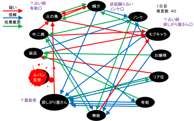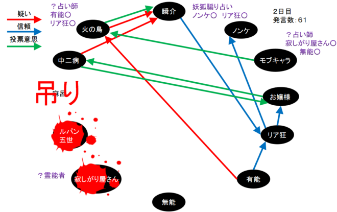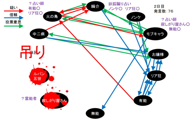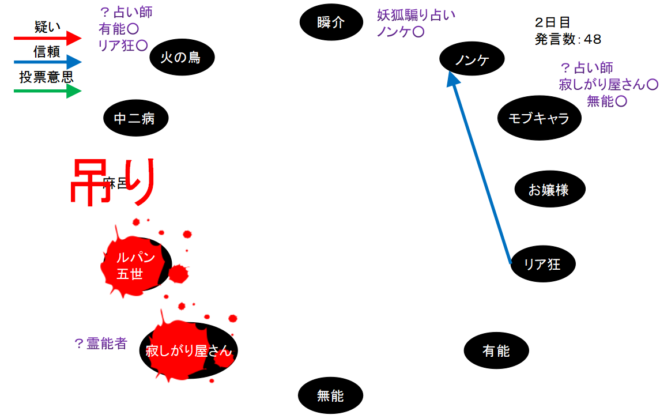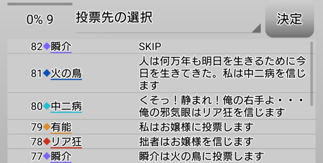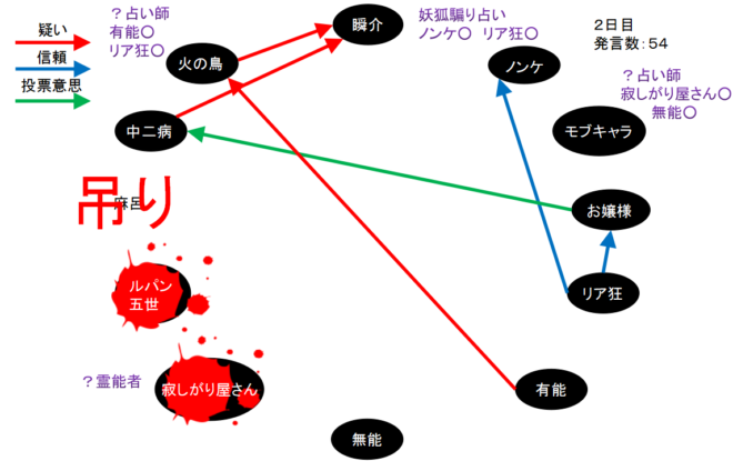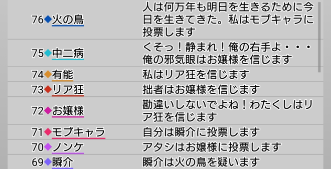火の鳥の疑い矢印がふらふらと怪しい。もともとそういう性格ではあるんだよね。モブキャラも火の鳥も配役がわからないように思えてしまうな。俺もふらふらと動いておくか。いや、投票宣言の後に動くのはおかしくない・・・な。俺以外は偽物だ。『火の鳥を疑います!』」