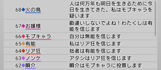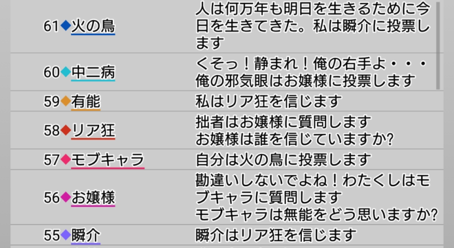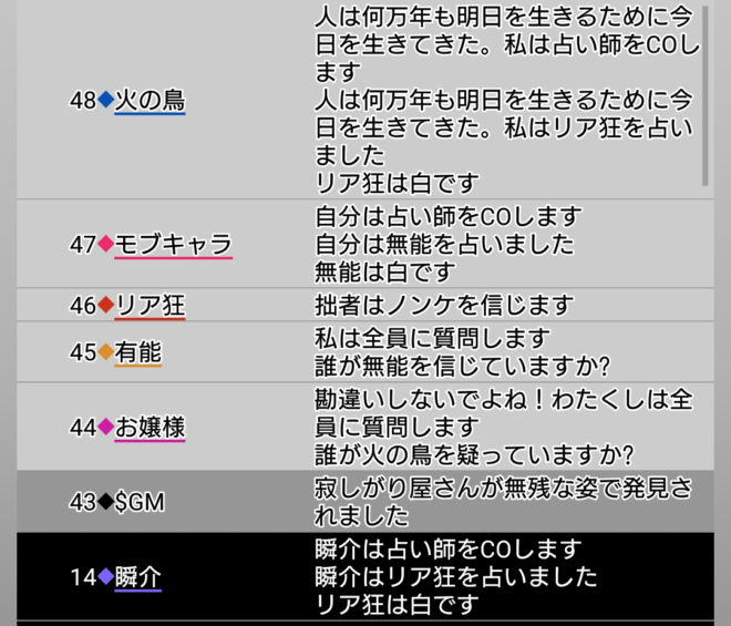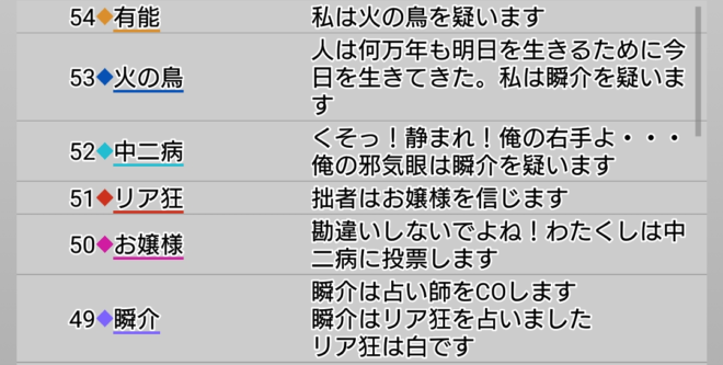 瞬介「おっと?中二病の必死さが人狼っぽいなあ。お嬢様の強気も人狼っぽいっちゃぽいけど(笑)。うーん、今日で占い師の配役が分かれば嬉しいな。火の鳥が執拗に俺をマークしているのは俺が妖狐だと予想のつく立場にいるからか?となると火の鳥が人狼ということになる。そして俺が占ったノンケ、リア狂、のどちらかが潜伏人狼だ」
