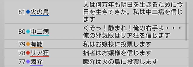 上の方で占い師が疑いあっているけど見るだけ無駄だ(笑)。こちらの方は憎み合いの3すくみとなっている。どこかの大陸でこんな時代があった気がするね。僕は真占い師なので占い師は全員あやしいと思います!『火の鳥に投票します』!