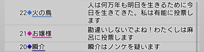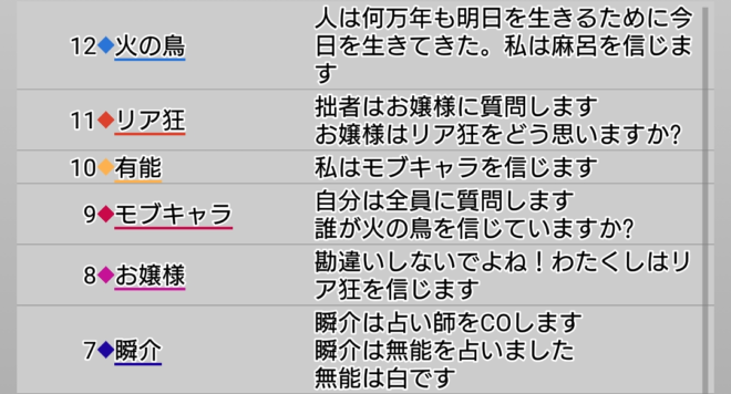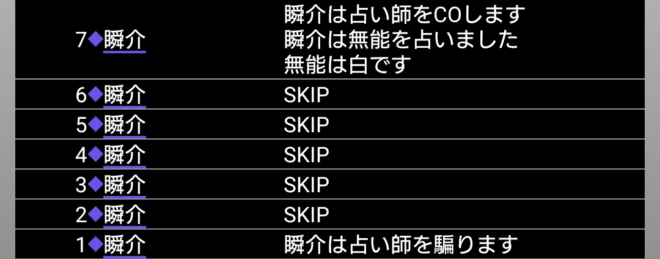 瞬介「もしかして、このまま占い師吊りにはならないよな。それだけは許して(泣)。あとは対抗占い師を疑ったり投票したりすることになる。その前に現状の発言情報を見てみよう。