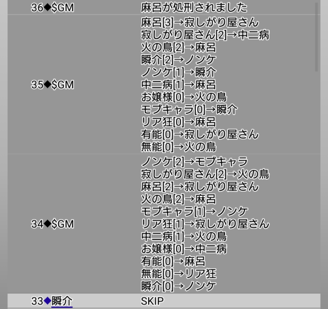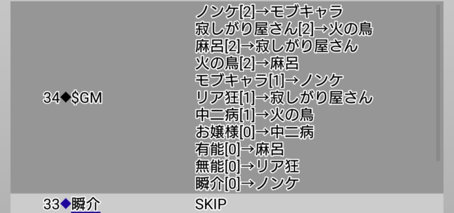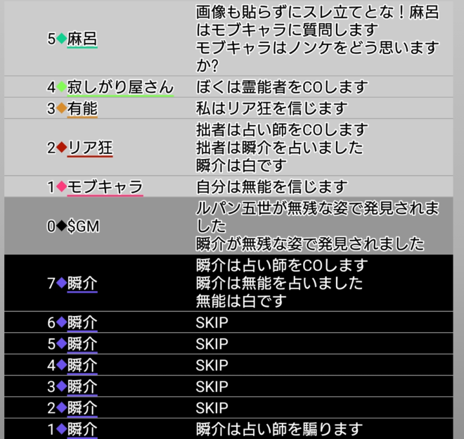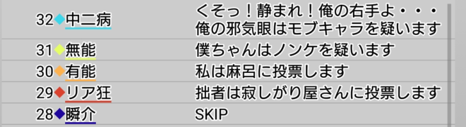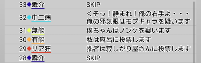 瞬介「さて。今回は初手で誰に○を飛ばすかだが、初手○先は熟慮しなければいけないのですね。なぜなら自分が偽○を飛ばした者は1日目の吊りをまぬがれる(○●になった場合はわからない笑)からだ。前回は1日目にノンケへ○を飛ばして、それがそのまま敗因になったわけでありますが、あのノンケ占いは『妖狐の練習さえできればいいや』とスキップを連打していった結果、プレイヤー番号が僕の次であるノンケへ自動的に○を出しとなってしまったのです」