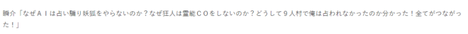 瞬介「妄想ばかり書き並べてしまい恐縮ではあります。このような推測を重ねて蓄積していくのはAIから人狼のセオリーを学べることになりますし、ゲームを楽しむ行為なのだと実感しております。事実、一戦一戦、AIの動向を考察するのが楽しくて仕方ありません」