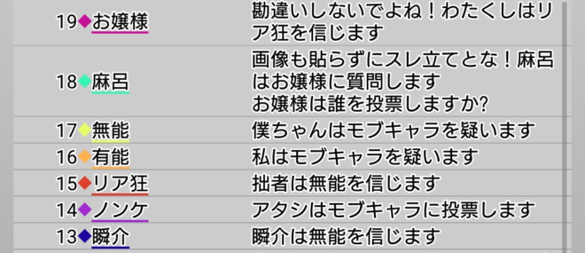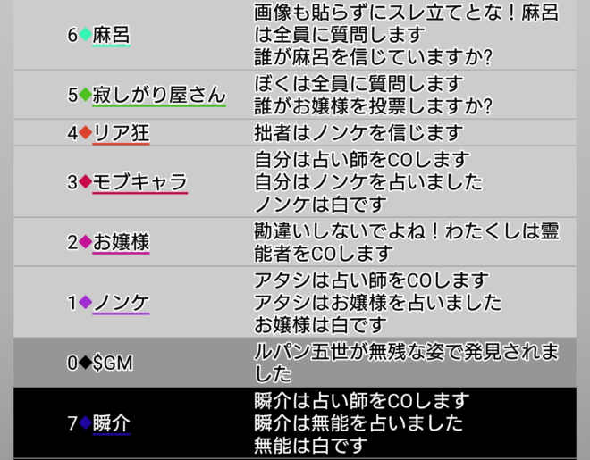 瞬介「おや?ノンケが真霊能者っぽいお嬢様を占っている。そしてモブキャラの占い先はノンケだ。占い師2人がぶつかっているぞ。こういう場合は俺が占い師として出てしまうと占いローラーになってしまうのだろうか?わかりません(泣)。しかし現状、ノンケ、モブキャラのどちらかが人狼陣営で破綻をしており真霊能であるお嬢様の立場は揺るがないものになるでしょうから、村有利なのかなと思います」