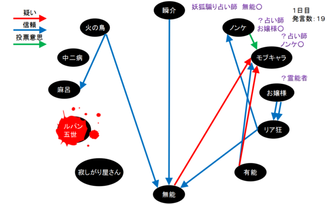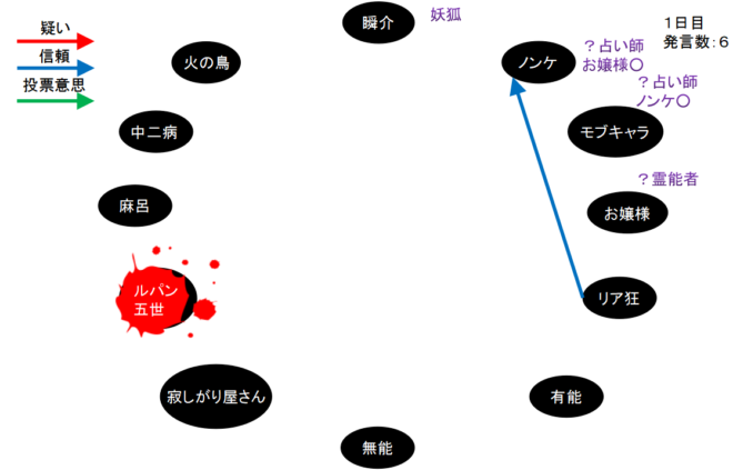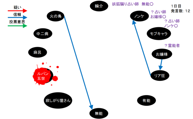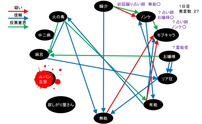 失礼。いきなり呪殺で退場となりました。ルパンを初日犠牲者、無能○出しの設定でゲームを再開させてください。