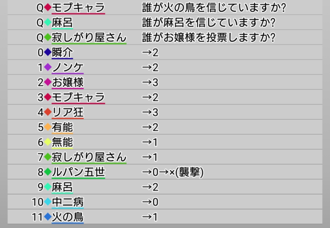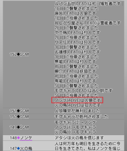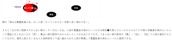 ただこの日に人狼が吊られてしまうと、また無茶な真霊能噛みを実行しにいくかもしれない。まだまだカウンターが大きく傾く機会は十分にある。ちなみに僕はけっこうピンチかもしれなくて唯一のアドバンテージは人狼から『狂』-『狐』の判別がついていないことだろう。