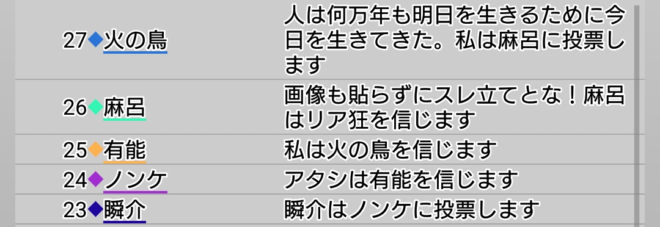 瞬介「今回も麻呂吊りになるのかな?やつは案外、1日目に吊られるな(笑)。それは良いとして、次は真占い師から●が出るおそれがある。俺が○出しをして重なったら真霊能者がいるので終わりだ(笑)。だからあえて占われなさそうな者に○をだすか、真が●出しをすると予測をして俺も勝負の●出しをするか。だけど●出すと配役がしぼられて占い師の吊りが早まりそうだからなあ」