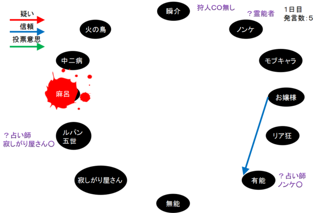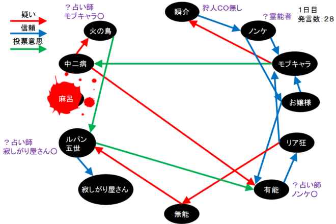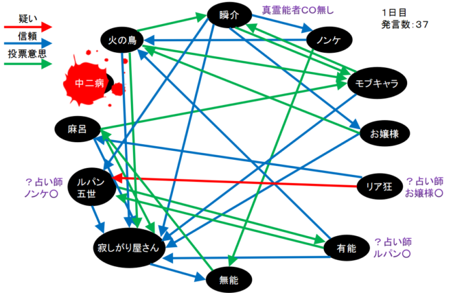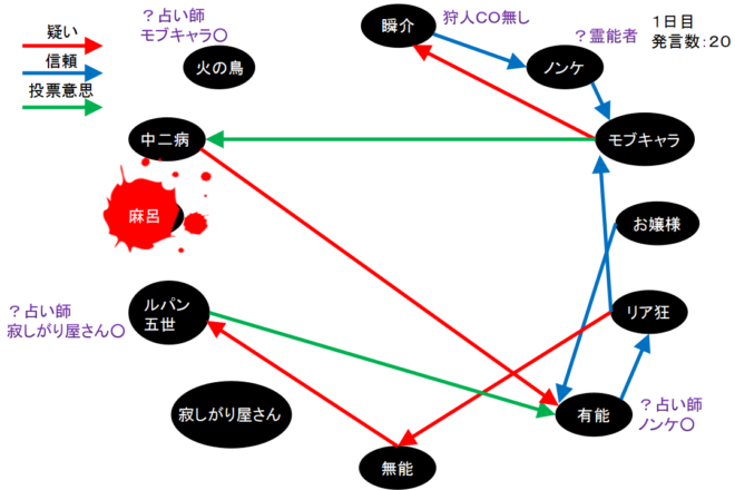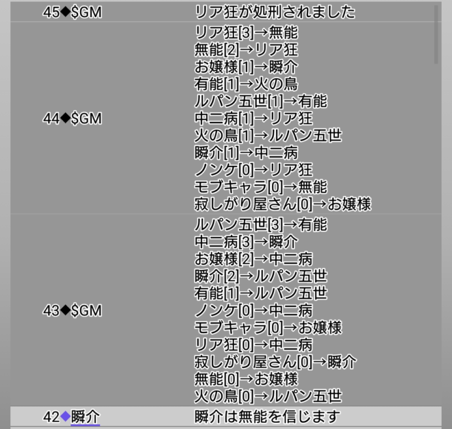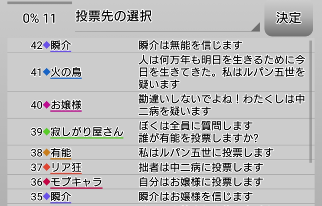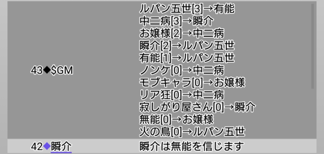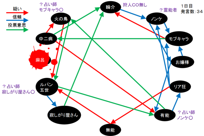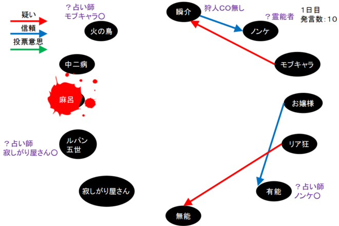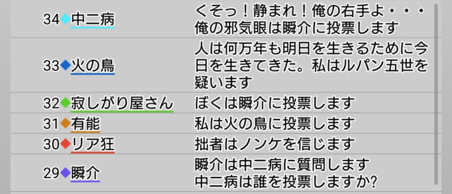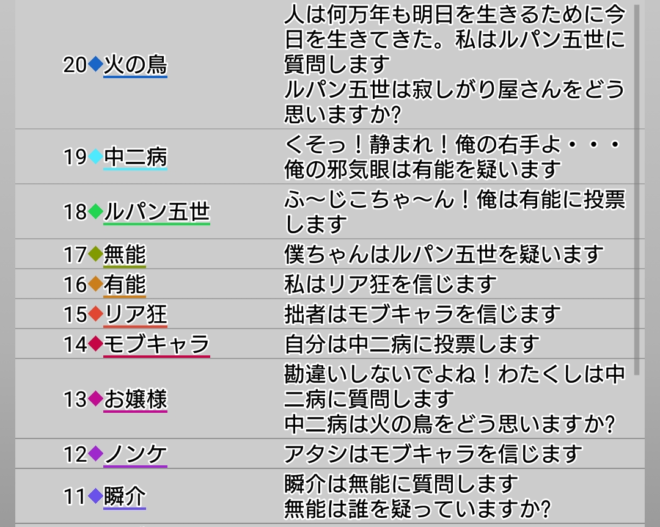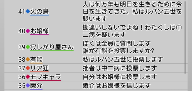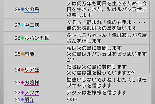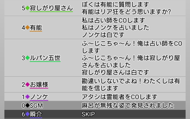 瞬介「おっと?ルパンと有能の占い師対決か。これは楽しみだなあ。完全グレーの者は『俺、モブキャラ、お嬢様、リア狂、無能、中二病、火の鳥』と7人もいるのか」