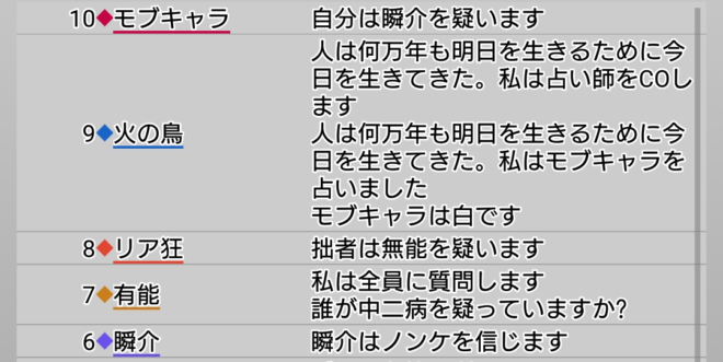 瞬介「ぐわっ!もの凄い数の発言が発生した!何が起こったっての?火の鳥が占い師COをしたので処理する情報が増えてAI達が騒ぎだしたのか?無能からリア狂へ不信発言を引き出すという俺の目論見は失敗したようだな。火の鳥が占ったモブキャラが信用されているってことは遅くCOした占い師の方が信頼されるのだろうか」
